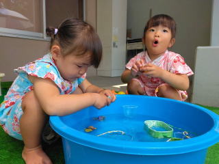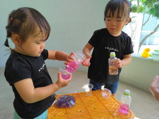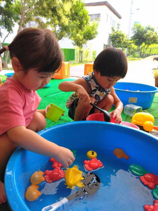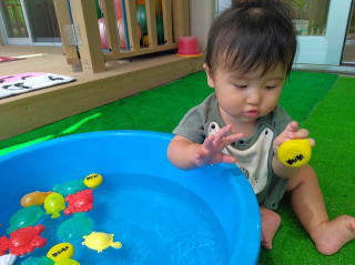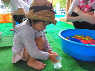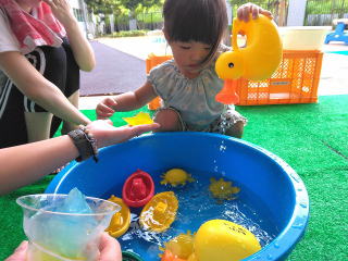 お魚すくいや色水遊び、ペットボトルシャワーなど、お気に入りの遊びを見つけて楽しんでいた子ども達。