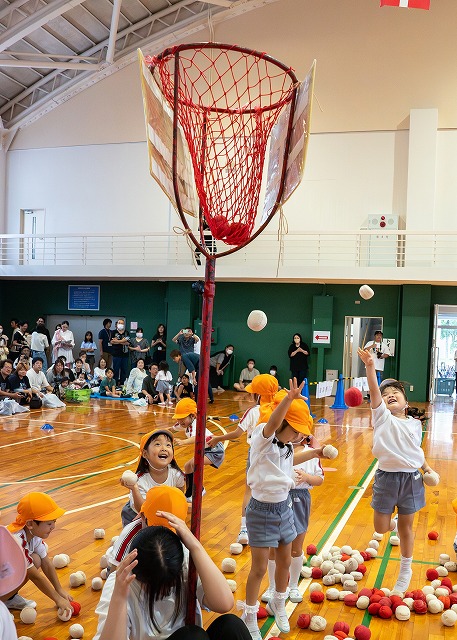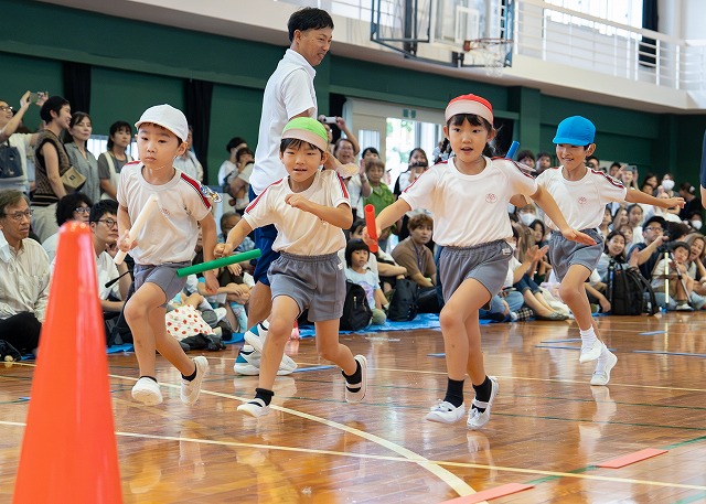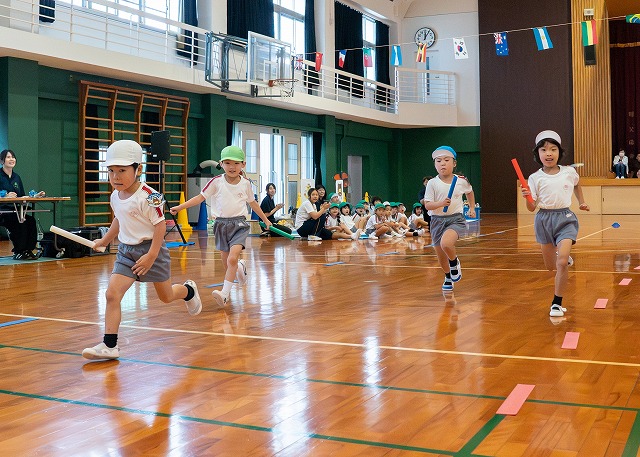 子ども達が普段の生活の中で楽しんでいる運動遊びを、お家の人にもご覧いただきました。お友達と一緒に「がんばれー!」と応援したり、「やったー!」と喜んだりする姿は、どの子もにっこり笑顔♪